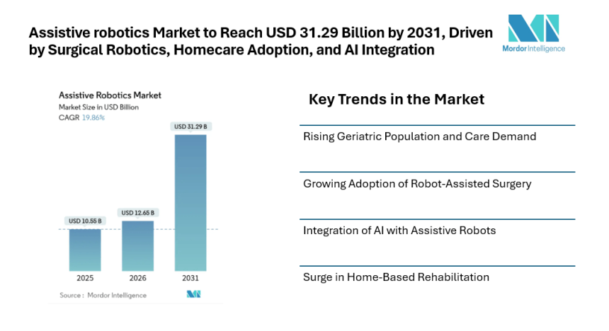 According to Mordor Intelligence, the assistive robotics market size is valued at USD 10.55 billion in 2025 and is projected to grow to USD 12.65 billion in 2026. Over the forecast period, the assistive robotics market forecast indicates that the market will reach USD 31.29 billion by 2031, expanding at a CAGR of 19.86%. The assistive robotics market growth is closely linked to demographic shifts, reimbursement reforms, and the practical need to manage long-term care efficiently. From hospital operating rooms to homecare environments, robots are moving beyond pilot projects into everyday healthcare workflows, strengthening the assistive robotics market share across regions.