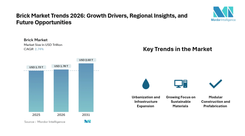 According to the Mordor Intelligence report, the brick market size is estimated at USD 1.78 trillion in 2026, growing from USD 1.73 trillion in 2025 and projected to reach USD 2.03 trillion by 2031. The market is expected to grow steadily as construction activity expands across developing and developed regions.