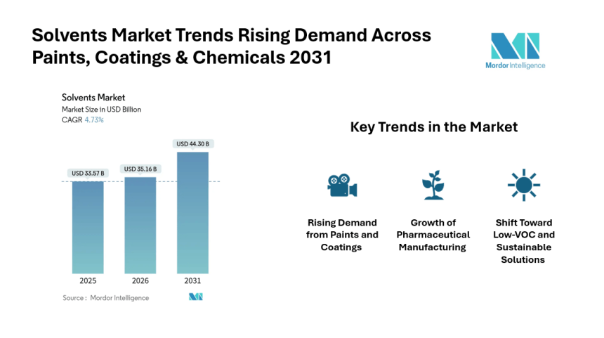 The solvents market continues to play a central role across multiple industries, including paints and coatings, pharmaceuticals, adhesives, and chemicals. According to Mordor Intelligence, the global solvents market size was valued at USD 33.57 billion in 2025 and is estimated to grow from USD 35.16 billion in 2026 to reach USD 44.30 billion by 2031, at a CAGR of 4.73% during the forecast period. This steady solvents market growth reflects consistent demand from end-use industries along with gradual changes in formulation practices.