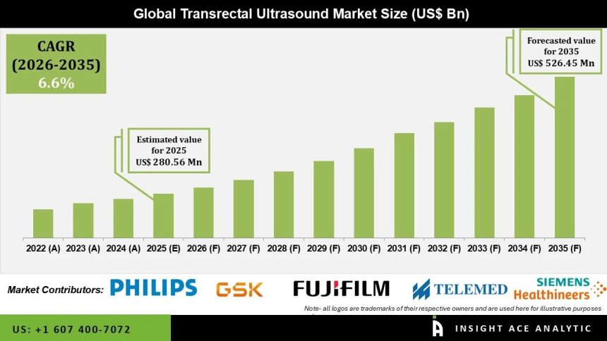 Transrectal Ultrasound Market Size is valued at USD 280.56 Mn in 2025 and is predicted to reach USD 526.45 Mn by the year 2035 at a 6.6% CAGR during the forecast period for 2026 to 2035.